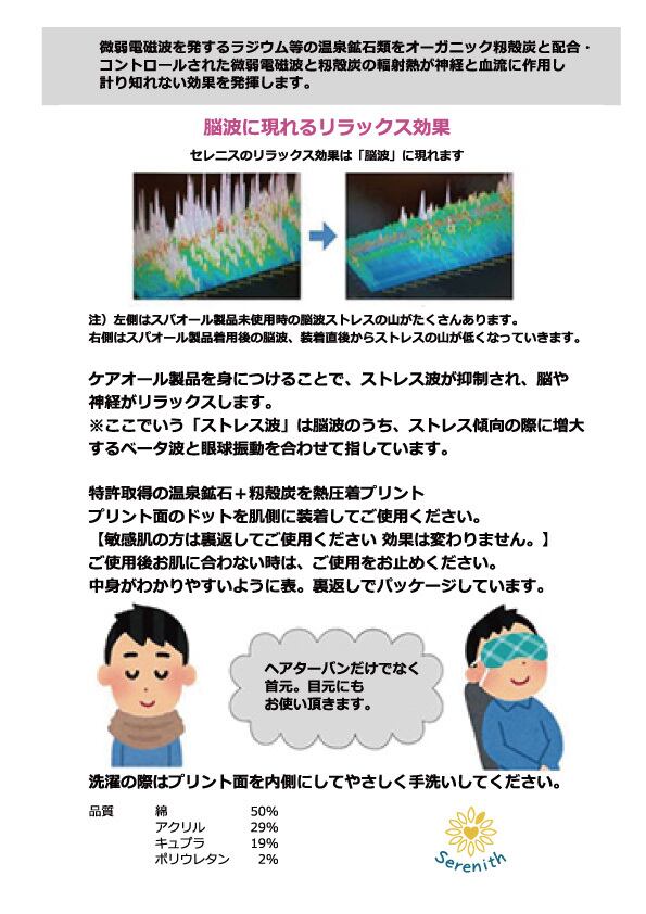 この遠赤外線マルチターバンは、ストレス波(ベータ波と眼球振動)が抑制され、脳や神経がリラックス効果が期待できる特別なアイテムです。遠赤外線の特性により、血行を促進し、リラクゼーションをサポートします。心地よいフィット感を実現し、へターバンだけでなく首元や目元にもお使いいただけるので快適にご使用いただけます。日常のアクセサリーとしてはもちろん、スポーツやリラックスタイムにも最適です。暖かさを感じながら、心身ともにリフレッシュしましょう!