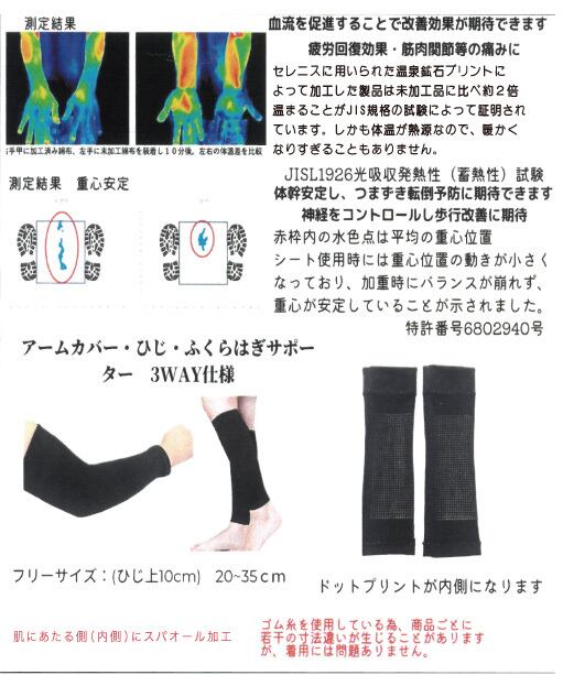 内側(肌側)「スパオール」をプリントしたアームカバー、ひじ、ふくらはぎ3Wayサポーターをお届けします。